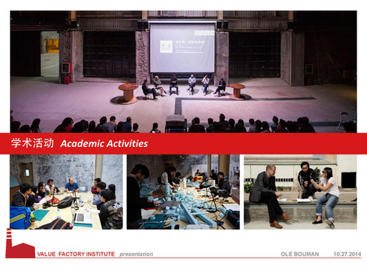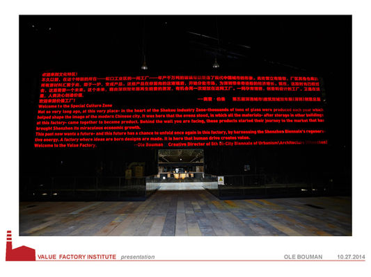 Rather than temporarily running the "main venue" of the 5th Shenzhen Urbanism and Architecture Bi-City Biennale in 2013, I proposed to curate a lasting transformation into an actual “Special Culture Zone” poised to become an important place for cultural production in Shenzhen for the years to come. The actual regeneration from a place of mass production to a place for ideas, renamed as Value Factory, broke down into three parts: 1. a physical transformation to expose and amplify the unique qualities of an industrial building and site and hence a showcase of the power of design to rescue value; 2. the temporary inhabitation by a range of global cultural institutions, to study, expand, leverage and show their work in China; 3. the organization of a wide range of public activities, to bring the factory alive on a daily basis, including the running of a design school for the duration of the Biennale. The plan was executed by a small team, including Liu Lei, Jorn Konijn and Vivian Zuidhof.